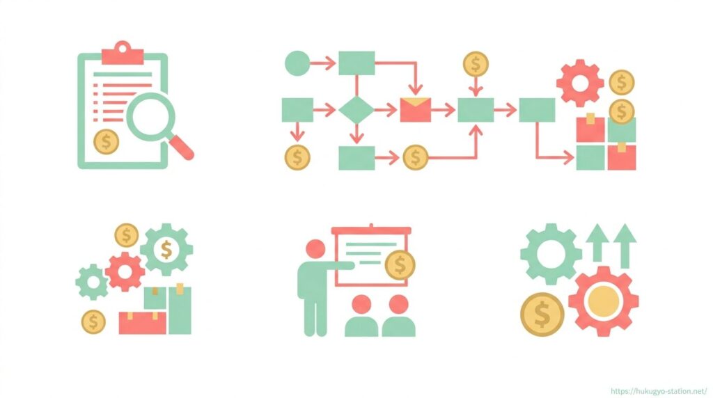 工程の間で平均15分待っているなら、引き渡しルールを決めて5分以内に抑えることで、全体の作業時間を6時間から4時間程度まで短縮し、同じ人数でも1日の出荷件数を200件から260件程度まで増やせます。
