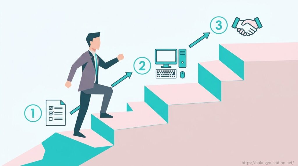 副業コンサルを始めるには、いきなり案件に応募するのではなく、事前の確認から登録、実績づくりまで順番に進めることが重要です。ここでは、会社員のままでも無理なくスタートするための基本的な手順を具体的に整理していきます。