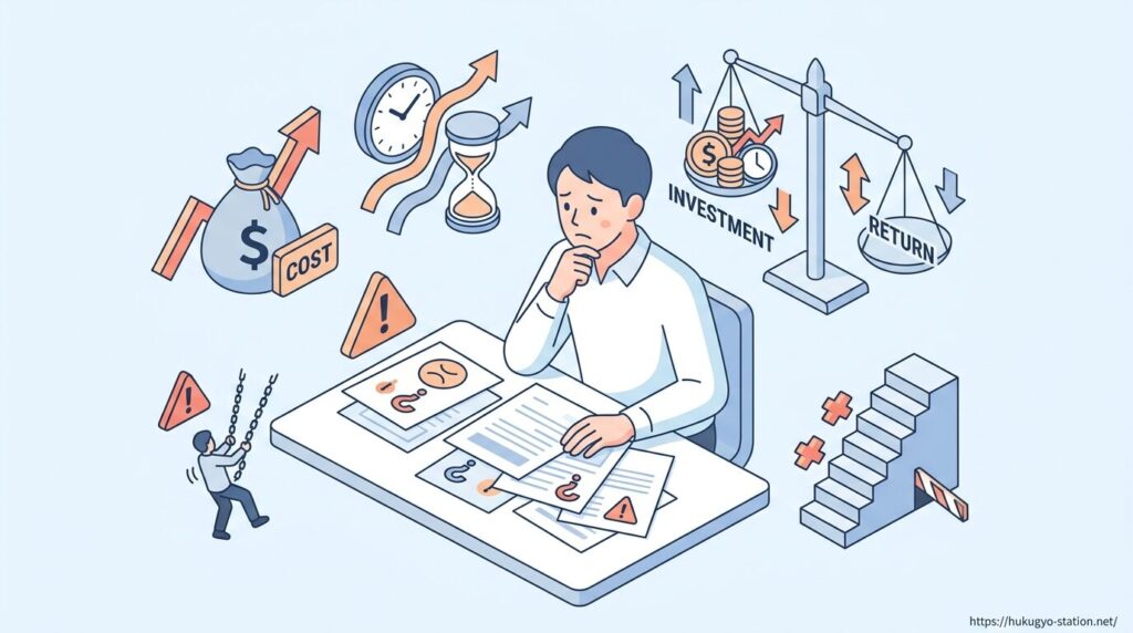 個人向けSNSコンサルは、運用の方向性を明確にし成果につなげやすくなる一方で、利用するうえでの負担やリスクも存在します。特に、単発相談でも1回5,000円〜30,000円、継続契約では月額30,000円〜150,000円程度の費用が発生するため、投資に見合う成果が求められます。また、実績や分析力に差があるコンサルタントを選んでしまうと、具体的な改善につながらないケースもあります。