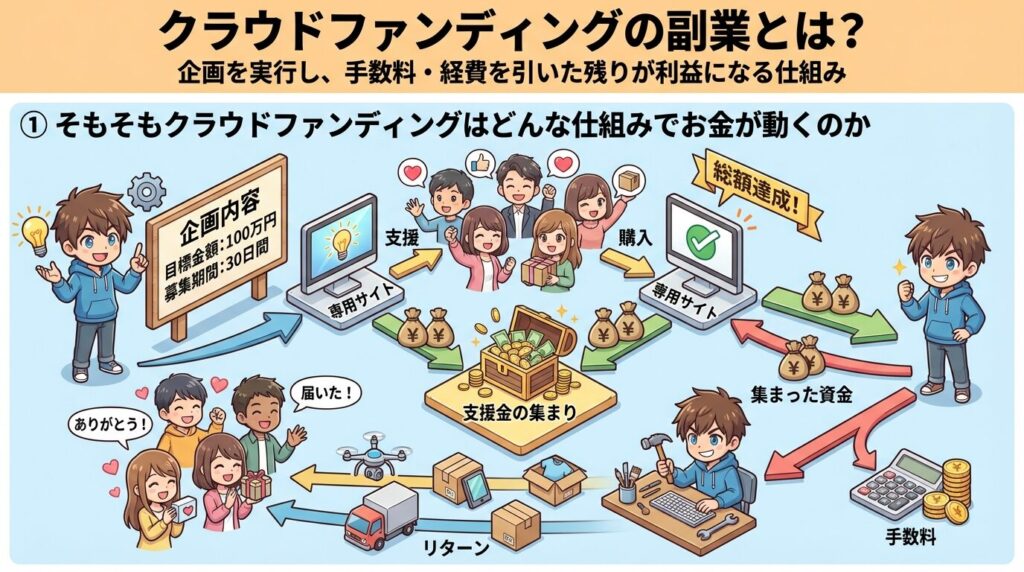 クラウドファンディングの副業は、商品やアイデアに共感した人から資金を集め、その資金をもとに企画を実行し、差額や手数料後の利益を得る仕組みです。ただし「お金が集まる」というイメージだけで始めると、手数料や原価、税金を差し引いた後にどれだけ残るのかが見えにくくなります。まずはクラウドファンディング自体の基本的な仕組みと、お金がどのように動くのかを理解し、そのうえで副業として成立する流れを押さえておくことが重要です。
