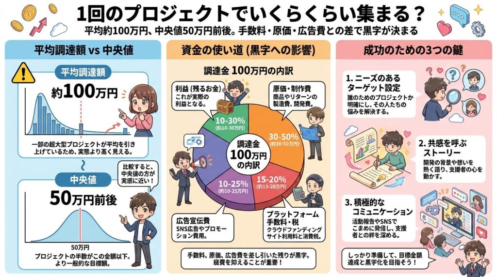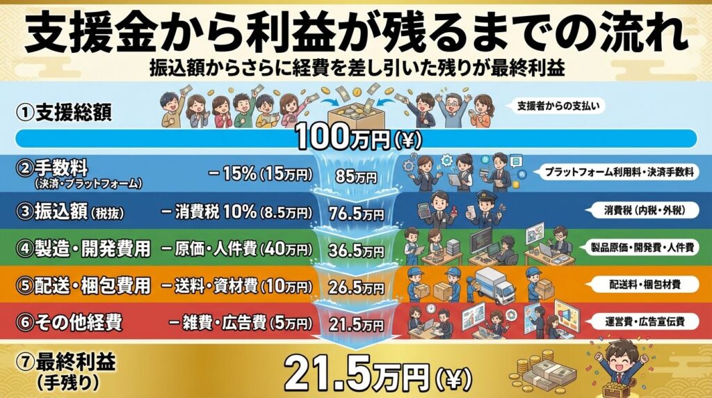 さらに、目標100万円に設定して未達で終了すれば、入金は0円です。目標金額を上げるほど、達成難易度も上がります。実際に残る金額は、「支援総額 − 手数料 − 原価 − 広告費 − 税金」で決まります。