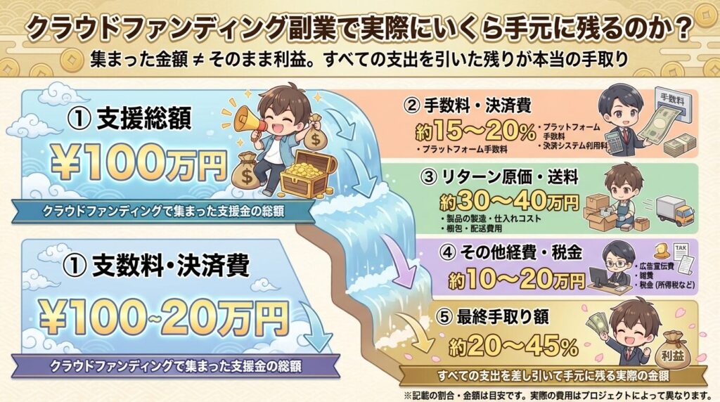 クラウドファンディング副業で「いくら稼げるのか」を考えるときは、集まった金額=そのまま利益ではありません。実際には、プラットフォーム手数料、商品やリターンの原価・送料、さらに後から支払う税金まで差し引いた金額が本当の手取りになります。ここでは、お金が差し引かれていく順番に沿って整理し、最終的にいくら手元に残るのかを具体的に見ていきます。
