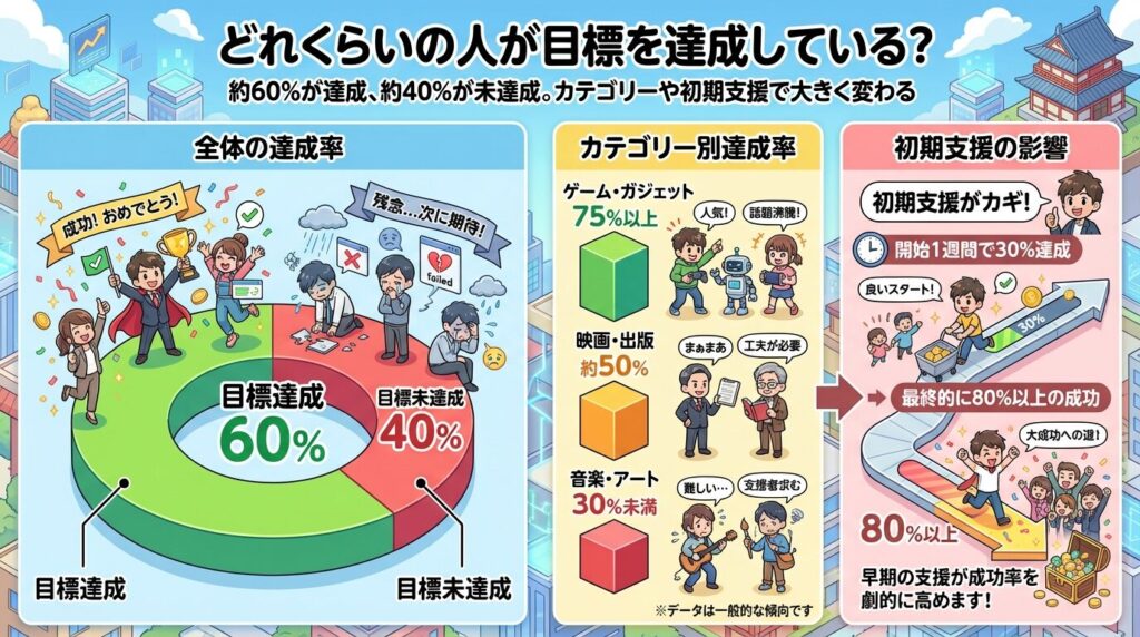 国内の主要クラウドファンディングサイトでは、目標金額を達成できる案件は約60%前後と公表されることが多いです。つまり、10件公開すると、約6件は達成し、約4件は目標未達で終了します。