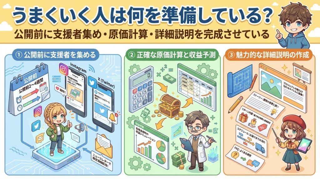原価・送料・手数料を事前に計算し、支援が増えても赤字にならない価格を設定しています。例えば、原価率が60%を超えないようにし、送料も地域別に計算しています。リターンの内容、数量、発送予定日を具体的に記載し、「いつ届くのか」「何が届くのか」を明確にしています。公開前に集客計画と資金計算を終えていることが共通点です。
