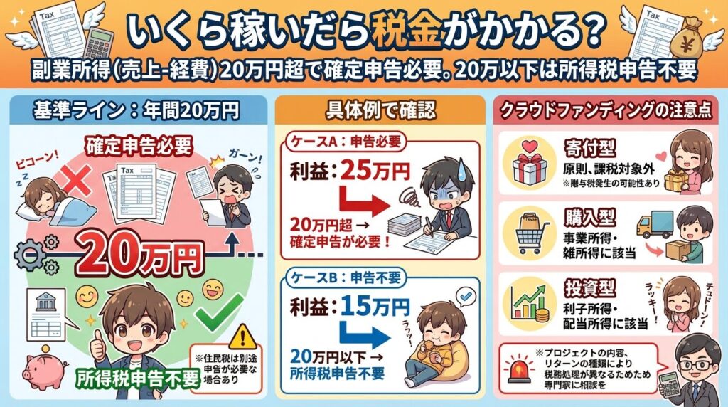 会社員が副業としてクラウドファンディングで利益を出した場合、年間の副業所得(売上−経費)が20万円を超えると、原則として確定申告が必要になります。20万円以下であれば、所得税の確定申告は不要とされています(※住民税の申告は別途必要な場合があります)。