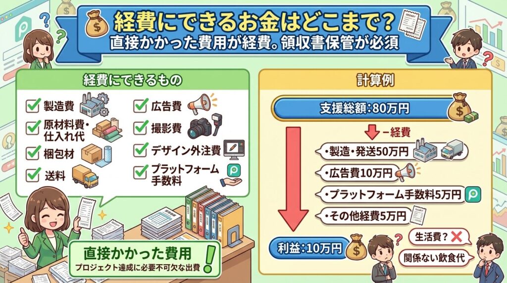 経費にできるのは、クラウドファンディングの実施に直接かかった費用です。具体的には、製造費、原材料費、仕入れ代、梱包材、送料、広告費、撮影費、デザイン外注費、プラットフォーム手数料などが含まれます。