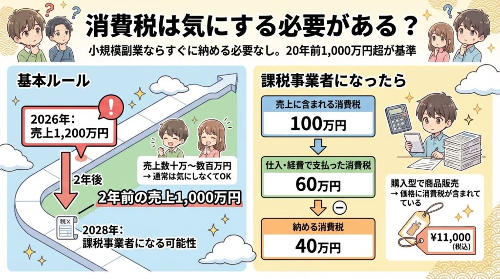 会社員が副業で小規模に行う場合、すぐに消費税を納める必要はありません。原則として、2年前(基準期間)の課税売上高が1,000万円を超えると、消費税の納税義務が発生します。例えば、2026年の売上が1,200万円を超えた場合、その2年後の2028年から消費税の課税事業者になる可能性があります。売上が数十万円〜数百万円規模であれば、通常は消費税を気にする必要はありません。