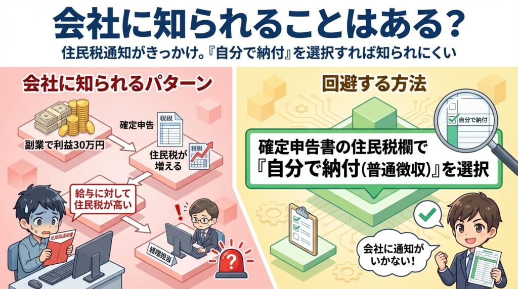 例えば、副業で30万円の利益が出ると、その分だけ住民税が増えます。会社の経理担当が「給与に対して住民税が高い」と気づくことで、副業が推測されることがあります。これを避けるには、確定申告書の住民税欄で「自分で納付(普通徴収)」を選択します。そうすると、副業分の住民税は自宅に納付書が届き、自分で支払います。給与から天引きされなければ、会社に知られる可能性は低くなります。