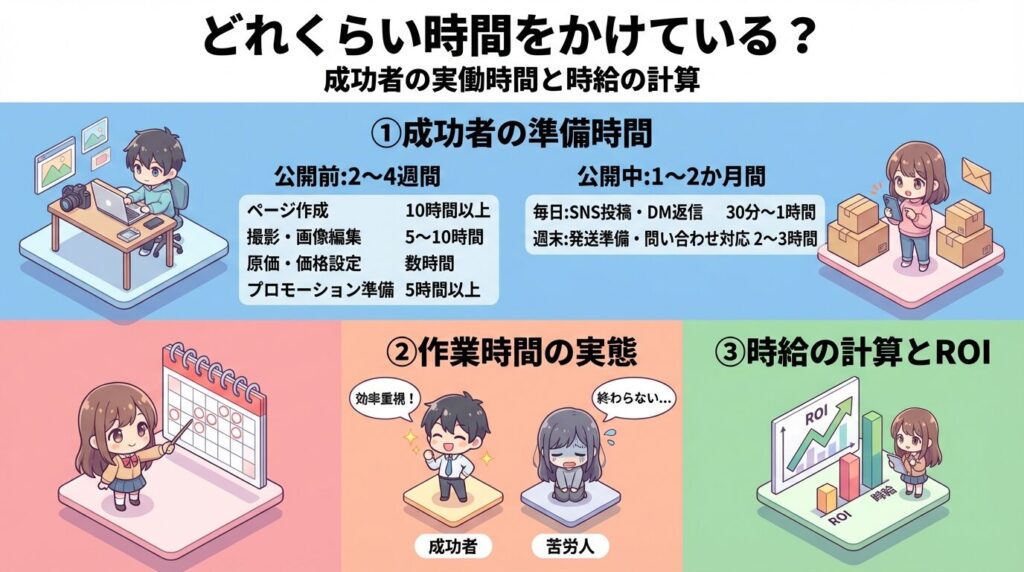 うまくいく人は、公開前に少なくとも2〜4週間かけて準備しています。ページ作成に10時間以上、写真撮影と編集に5時間、原価計算と価格設定に数時間を使っています。公開後も、毎日30分〜1時間はSNS投稿や支援者への返信に時間を使っています。