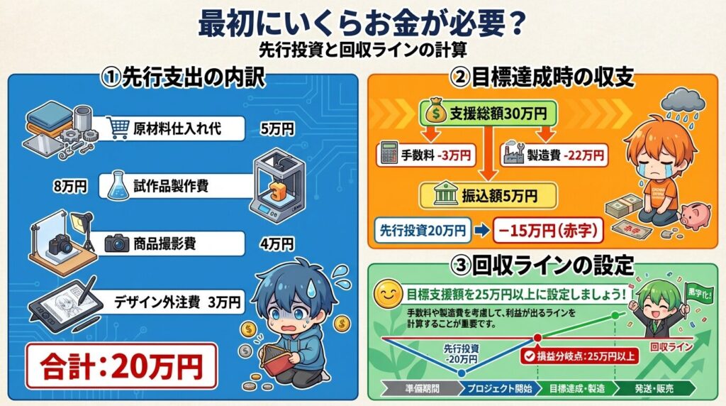 商品を作る場合、公開前に現金が必要です。具体的には、原材料の仕入れ代、試作品の製作費、商品写真の撮影費、デザイン外注費などです。例えば、試作と撮影で合計20万円かかる場合、その20万円は先に自分で支払います。目標金額を30万円に設定して達成しても、手数料と製造費で25万円かかれば、手元に残るのは5万円です。最初に出した20万円を回収できなければ、資金は増えません。