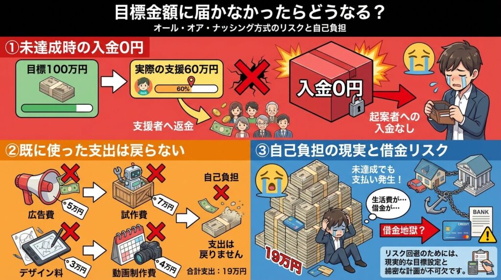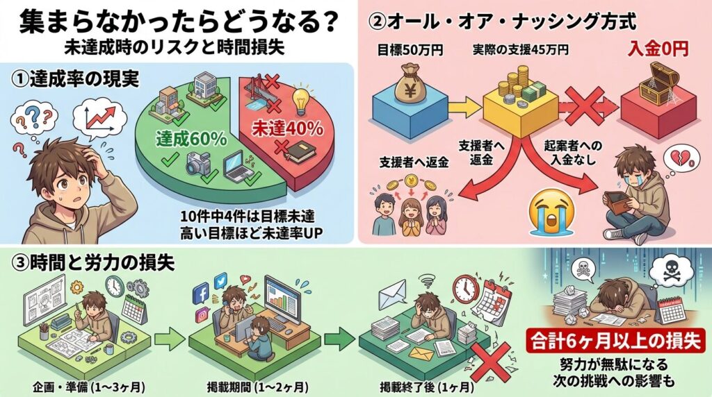 さらに、成功確率も現実的に見る必要があります。達成率が60%前後ということは、10件中4件は未達で終わります。目標金額を高く設定するほど未達リスクは上がります。未達の場合は入金0円という形式もあるため、準備費や広告費がそのまま自己負担になります。