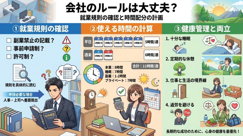 「会社の規定」と「使える時間」を並べて確認すると、無理なく続けられるかどうかが判断できます。