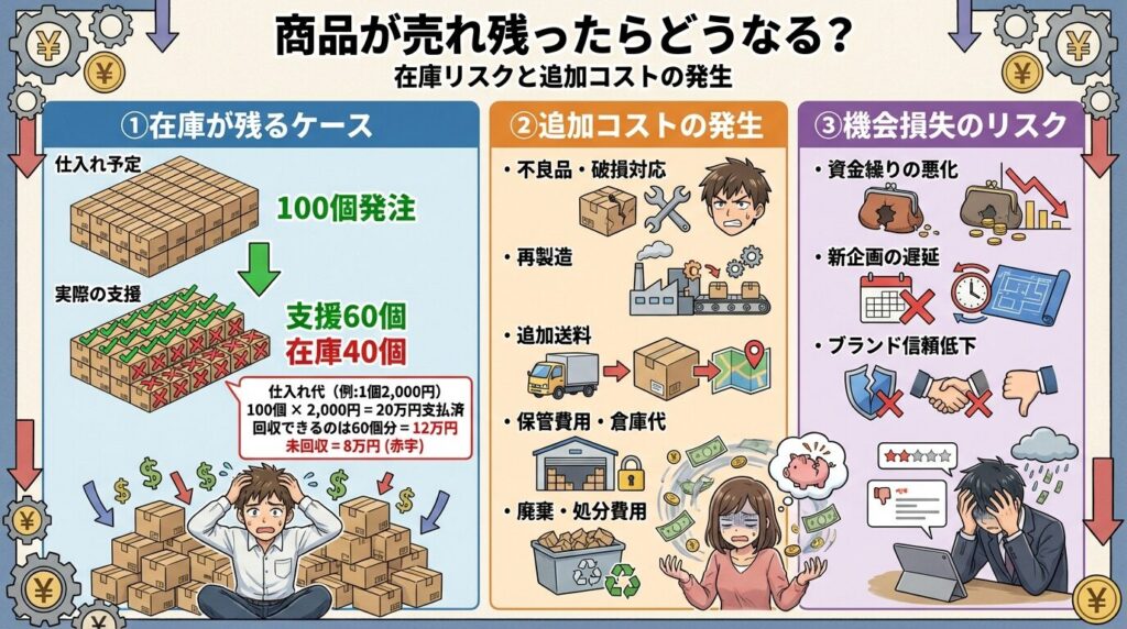 海外仕入れの場合は、為替変動で仕入れ単価が上がったり、輸送遅延で追加保管費がかかることもあります。仕入れ数量と実際の支援数がずれると、当初の利益計算は崩れます。