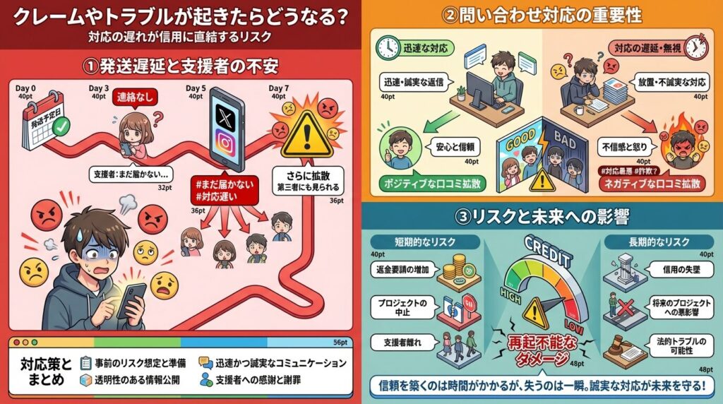 問い合わせに数日返信しないと、「対応が悪い」と書き込まれることがあります。支援者とのメッセージやコメントはページ上に残るため、対応内容がそのまま公開されます。例えば、10件の問い合わせに適切に対応しないと、評価が下がり、次回のプロジェクトに影響します。納期・説明・返信速度が、そのまま信用に直結します。
