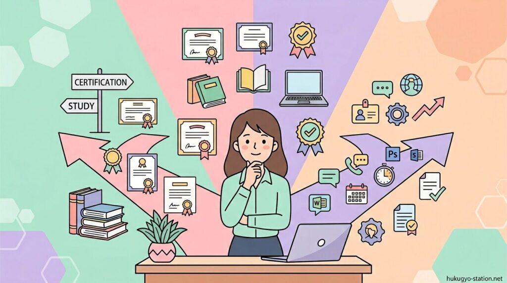 事務経験がある場合も同様に、業務内容を数値で提示して応募し、反応が取れるかで判断します。また、秘書検定はメール対応やスケジュール管理の精度向上、日商PC検定は資料作成やデータ処理の速度と正確性向上、日商簿記は仕訳や経理処理のミス削減に直結します。